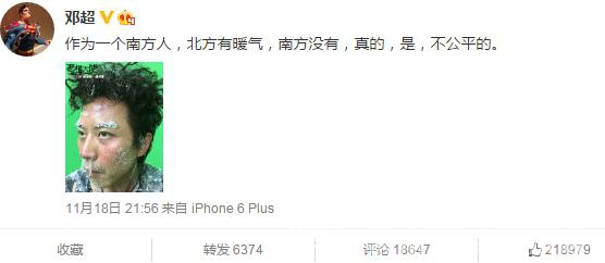 隨著天氣轉(zhuǎn)冷,網(wǎng)友紛紛關(guān)注起暖氣的問(wèn)題,鄧超也在微博上曬出一張臉被凍僵、鼻涕流出來(lái)被凍成冰的照片,并附文稱“作為一個(gè)南方人,北方有暖氣,南方?jīng)]有,真的,是,不公平的。”