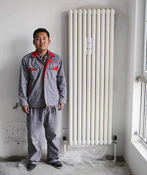 對了,差點忘了我們的安裝師傅,來個正面特寫。簡直不忍直視啊,暖氣片怎么顯得安裝師傅這么黑啊,開個玩笑,不要打我呀,哎住手....!