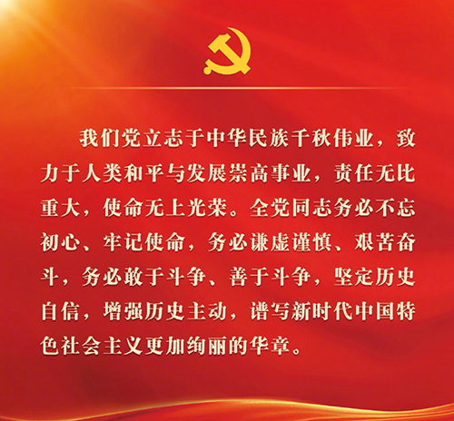 一、我們黨立志于中華民族千秋偉業(yè),致力于人類和平與發(fā)展崇高事業(yè),責(zé)任無比重大,使命無上光榮。全黨同志務(wù)必不忘初心、牢記使命,務(wù)必謙虛謹(jǐn)慎、艱苦奮斗,務(wù)必敢于斗爭、善于斗爭,堅定歷史自信,增強歷史主動,譜寫新時代中國特色社會主義更加絢麗的華章。