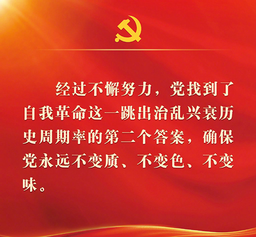 二、經(jīng)過不懈努力,黨找到了自我革命這一跳出治亂興衰歷史周期率的第二個答案,確保黨永遠不變質(zhì)、不變色、不變味。