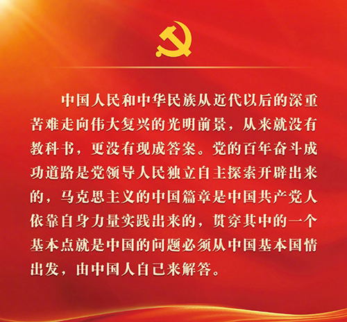 六、中國人民和中華民族從近代以后的深重苦難走向偉大復(fù)興的光明前景,從來就沒有教科書,更沒有現(xiàn)成答案。黨的百年奮斗成功道路是黨領(lǐng)導(dǎo)人民獨立自主探索開辟出來的,馬克思主義的中國篇章是中國共產(chǎn)黨人依靠自身力量實踐出來的,貫穿其中的一個基本點就是中國的問題從中國基本國情出發(fā),由中國人自己來解答。