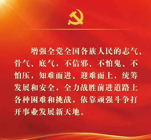 八、增強全黨全國各族人民的志氣、骨氣、底氣,不信邪、不怕鬼、不怕壓,知難而進、迎難而上,統(tǒng)籌發(fā)展和安全,全力戰(zhàn)勝前進道路上的各種困難和挑戰(zhàn),依靠頑強斗爭打開事業(yè)發(fā)展新天地。