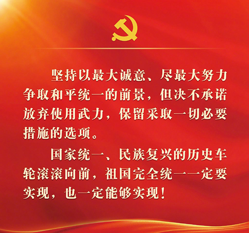 國家統(tǒng)一、民族復(fù)興的歷史車輪滾滾向前,祖國完全統(tǒng)一一定要實現(xiàn),也一定能夠?qū)崿F(xiàn)!