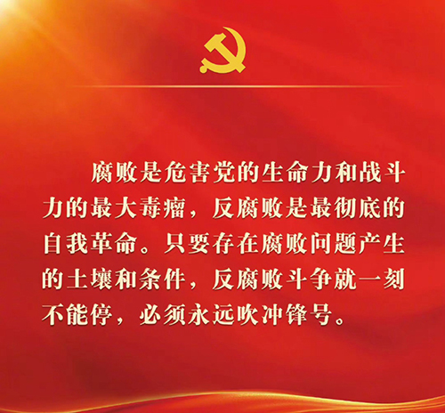 十、腐敗是危害黨的生命力和戰(zhàn)斗力的最大毒瘤,反腐敗是最徹底的自我革命。只要存在腐敗問題產(chǎn)生的土壤和條件,反腐敗斗爭就一刻不能停,必須永遠吹沖鋒號。